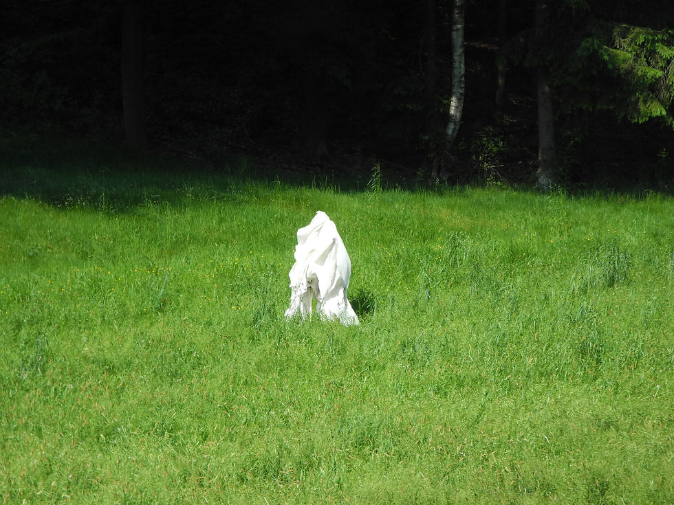 Wir wissen nicht, wofür die Figur auf der Wiese steht, für Anfang oder für Ende – oder beides? In ihr krümmt sich auch unser Leben vielleicht ins Unendliche, wo wir mit einem Jubelschrei beobachten werden, wie sich Parallelen lustvoll schneiden.