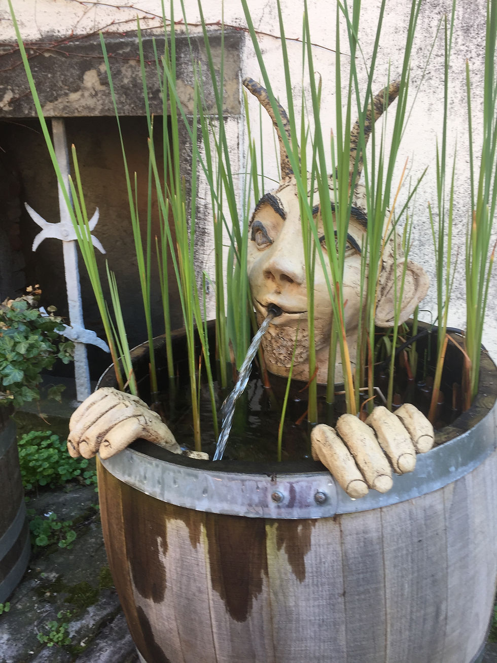 Manchmal muss der Teufel seinen aufgeheizten Körper kühlen, innerlich und äußerlich. Dann macht er ein Spritztour in die Menschenwelt. Mainfränkische Regentonnen liebt er besonders. Womit er das Wasser einsaugt, das er ausspuckt, ist theologisch noch nicht erforscht.
